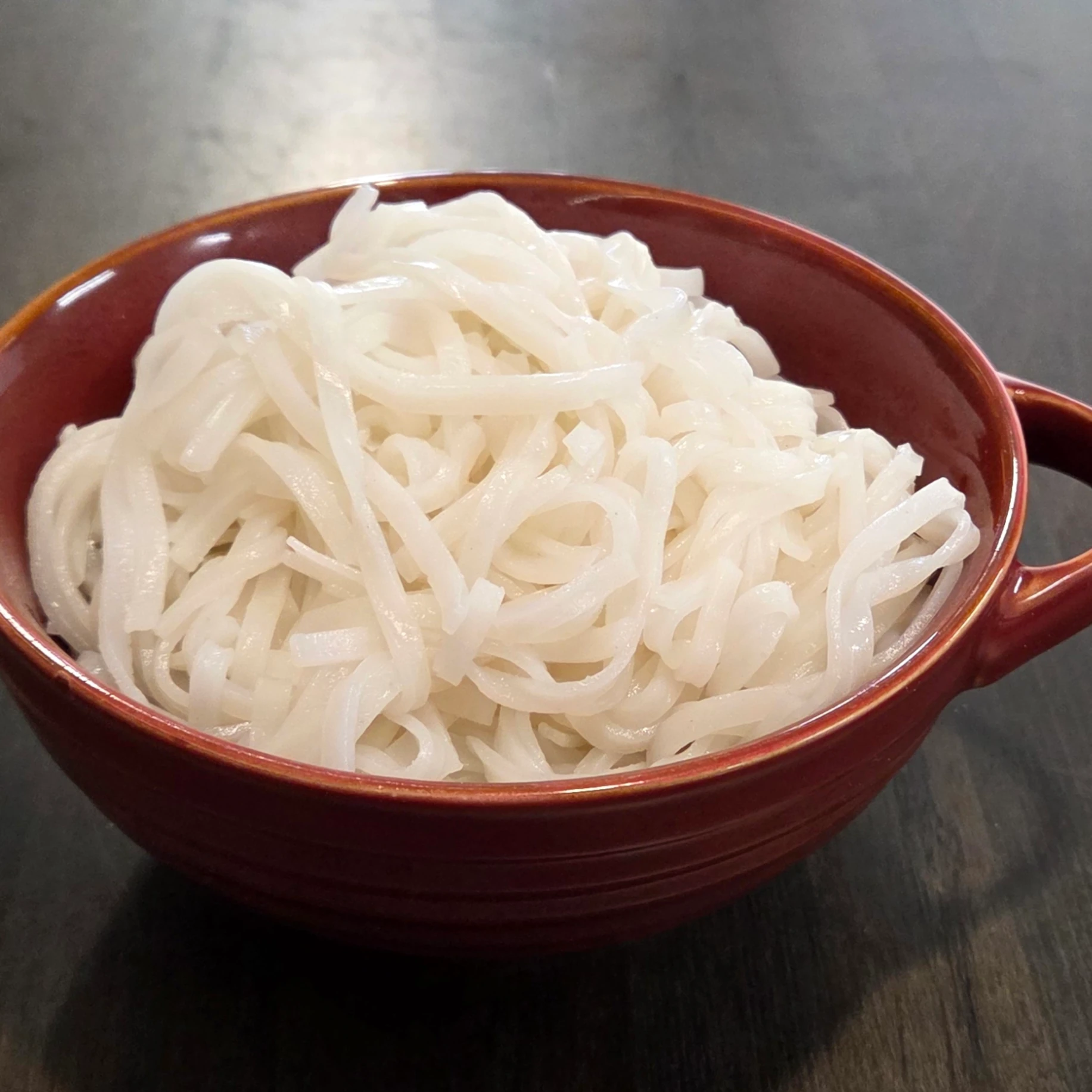 Stir-fried mung bean glass noodles with a delightful blend of egg, yellow onion, napa cabbage, green onion, carrots, and tomatoes, topped with fresh cilantro and a zesty lime wedge. Optional gluten-free on request.