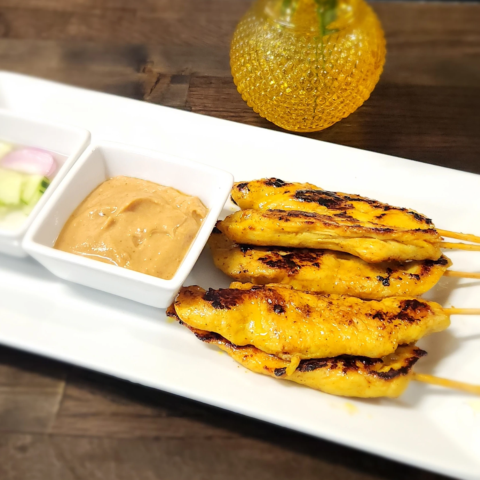 Grilled chicken skewers accompanied by a tantalizing peanut sauce and a flavorful cucumber & red onion vinegar sauce. This item is gluten-free.