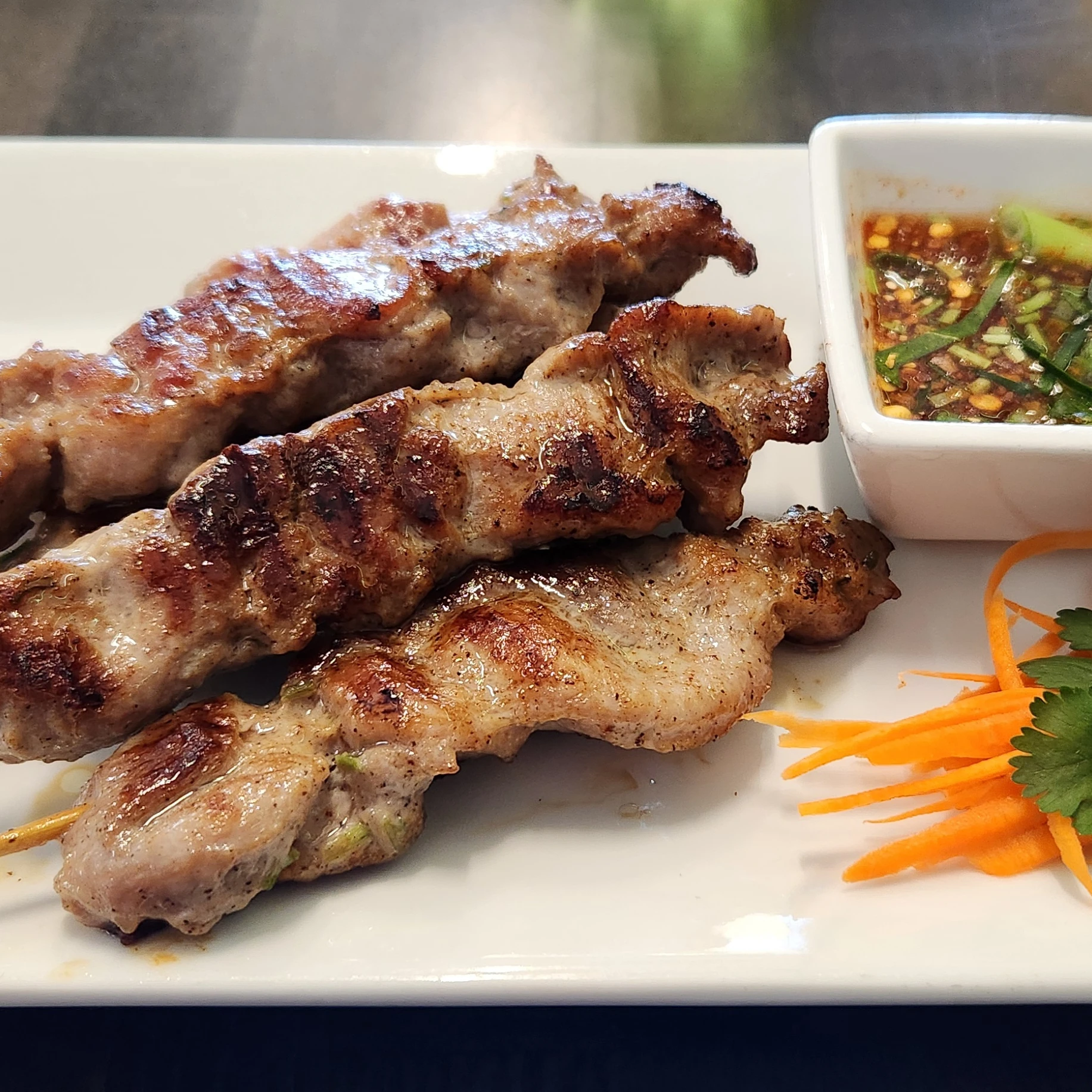 A Classic Thai Street Food: Pork skewers grilled flawlessly and served with a zesty homemade lime & herb sauce for an irresistibly tangy flavor. This item is gluten-free.