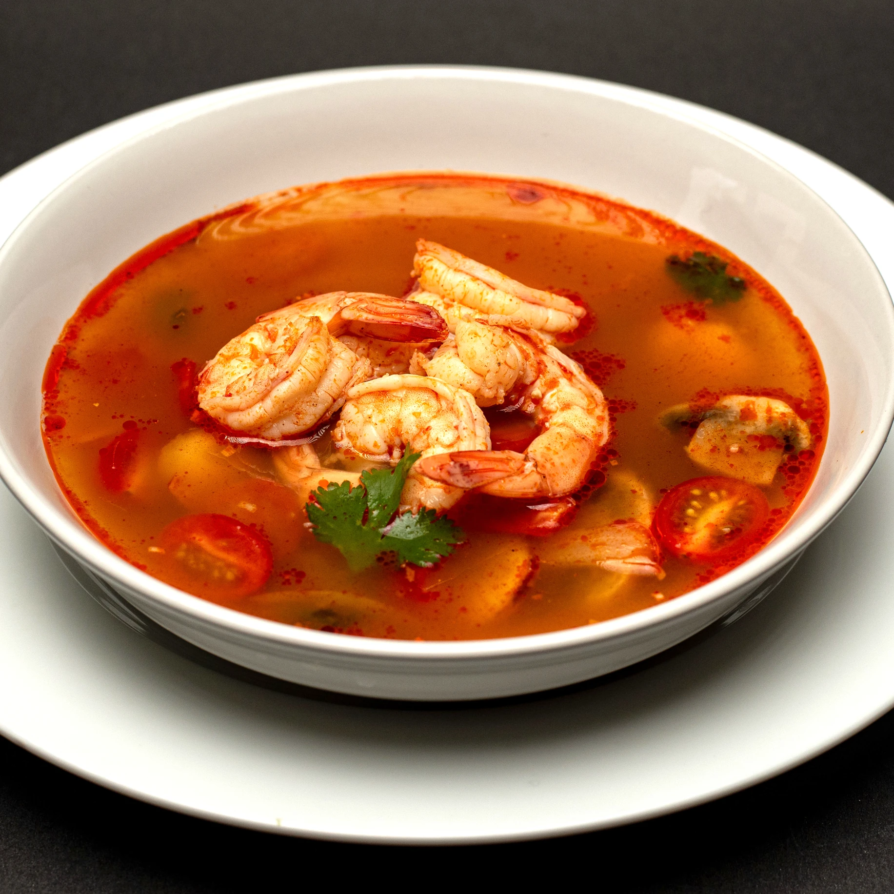 Savory Tom Yum Soup: Slightly spicy and slightly sour broth with your choice of protein, includes mushrooms, tomatoes, yellow onions, green onions, cilantro, and fragrant herbs for a vibrant taste. This item is gluten-free.