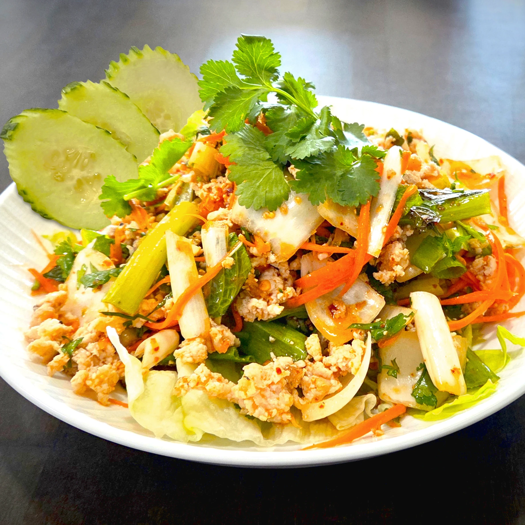 Minced chicken flavored with homemade sauce, fresh herbs, green onions, yellow onions, shredded carrots, and laab spices, complimented by crisp cucumber and served on a bed of lettuce. This item is gluten-free.