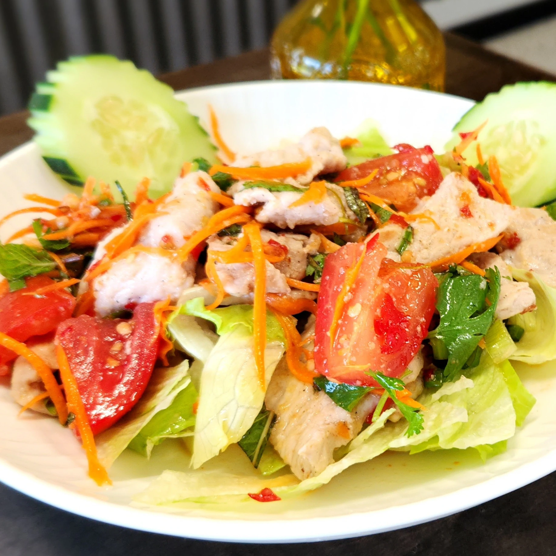 Succulent pan-grilled pork in zesty-tangy lime sauce with fresh herbs, green onions, yellow onions, tomatoes, and shredded carrots, garnished with cilantro and cucumbers, and served on a bed of lettuce. This item is gluten-free.