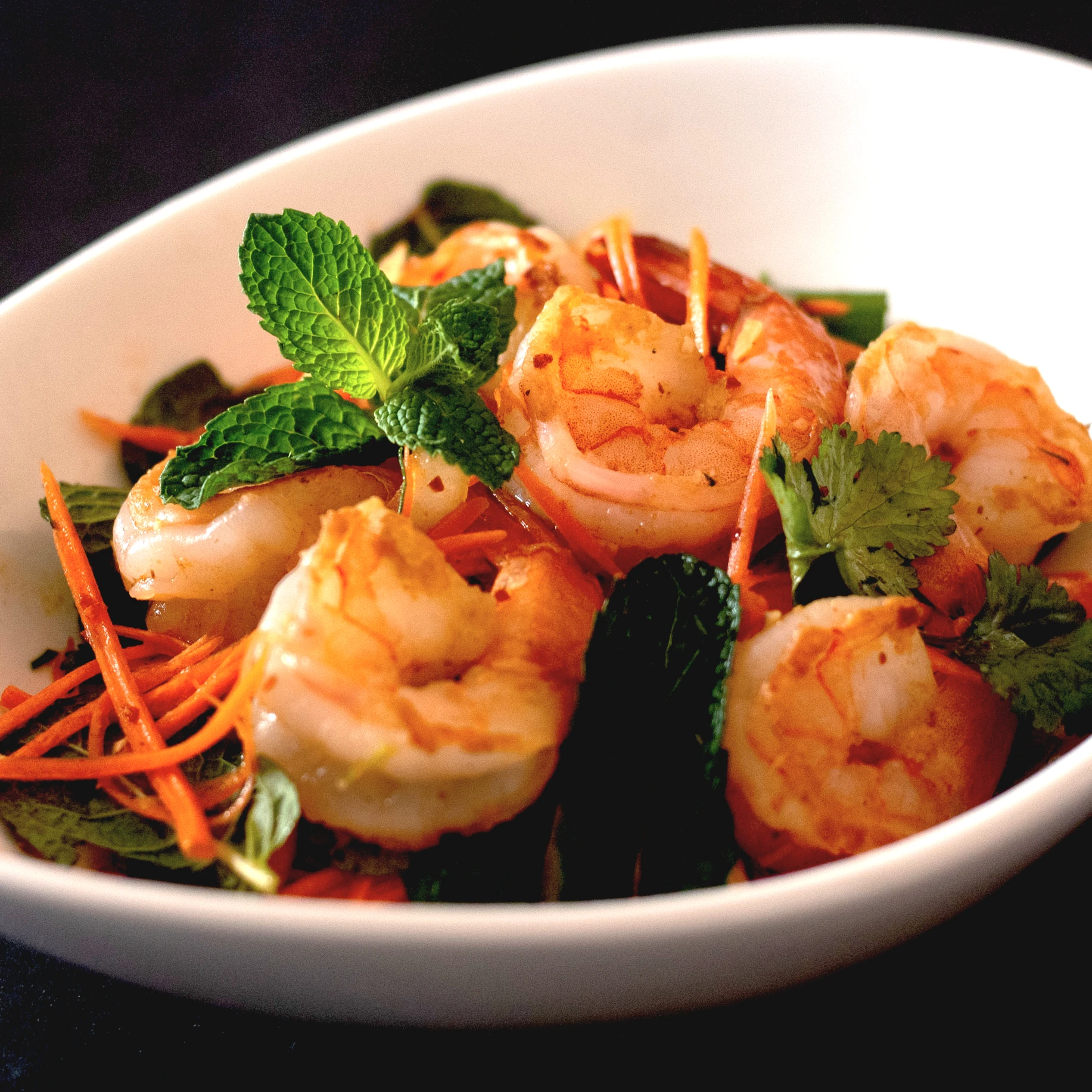 Classic Thai salad with plump shrimp, fresh herbs, shredded carrots, green onions, yellow onions, tomatoes, and a homemade spicy sauce with a kick for a delightful experience, served on a bed of lettuce. Garnished with fresh cilantro. This item is gluten-free.