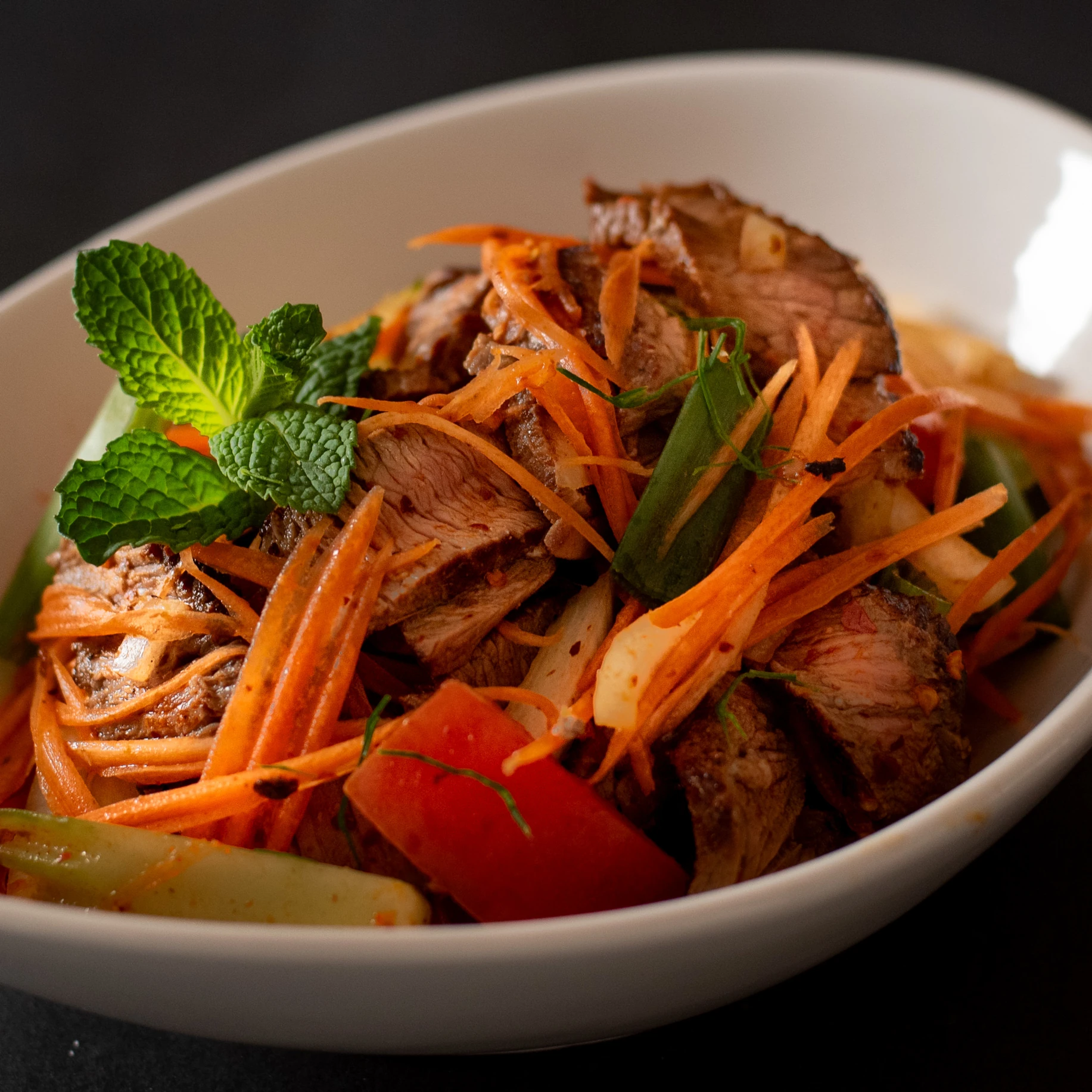 Pan-Grilled beef salad with homemade dressing and a delightful mix of fresh herbs, shredded carrots, green onions, yellow onions, red onions, tomatoes, and cucumber sprinkled with finely cut makrut lime leaves, served on a bed of lettuce. Garnished with cilantro. This item is gluten-free.