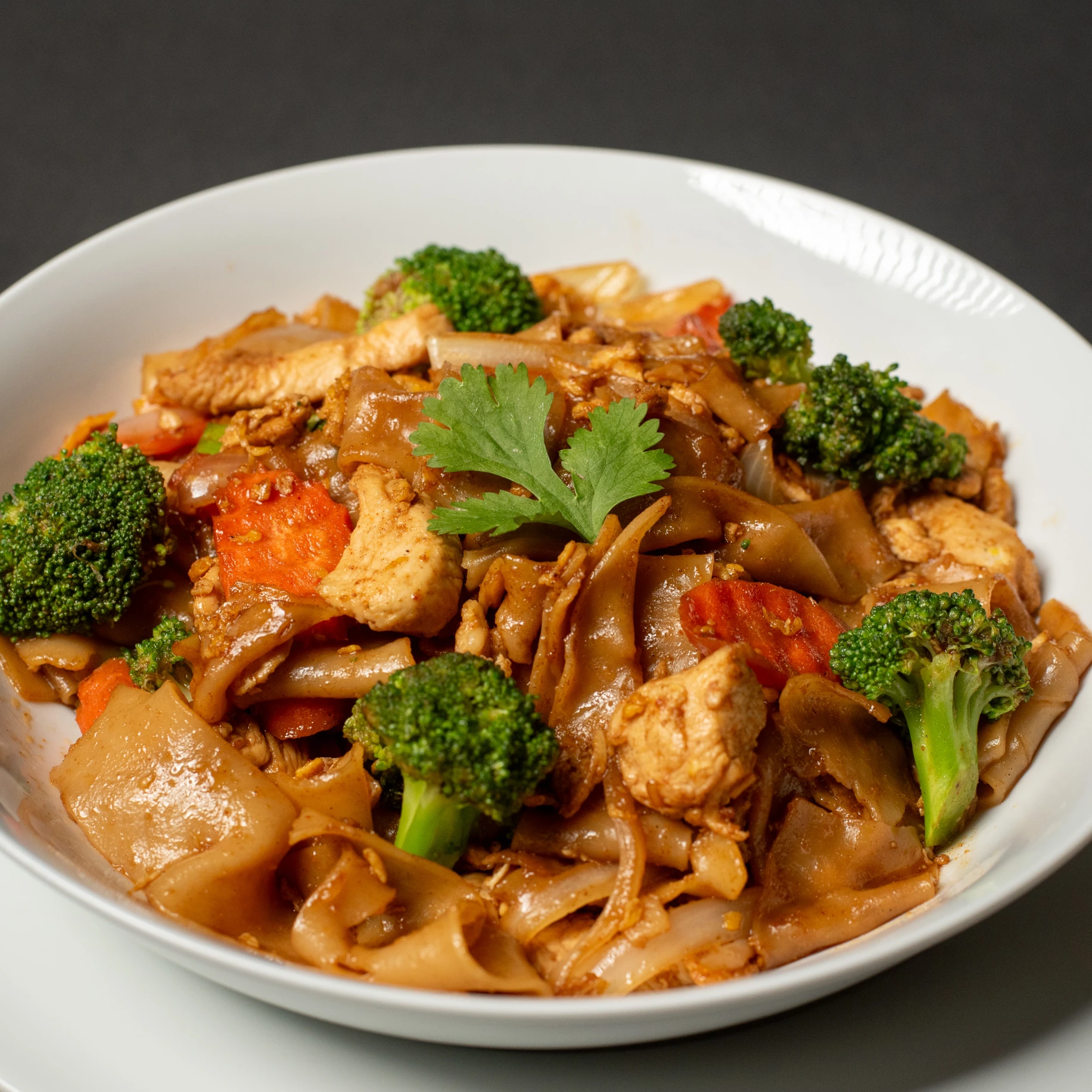 Stir-fried wide rice noodles with egg, crisp broccoli, sweet carrots, and flavorful yellow onion, finished with fragrant cilantro and a wedge of lime for an unforgettable taste! Optional gluten-free on request.