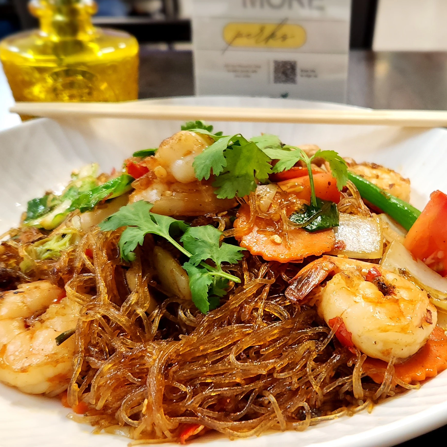 Stir-fried mung bean glass noodles with a delightful blend of egg, yellow onion, napa cabbage, green onion, carrots, and tomatoes, topped with fresh cilantro and a zesty lime wedge. Optional gluten-free on request.