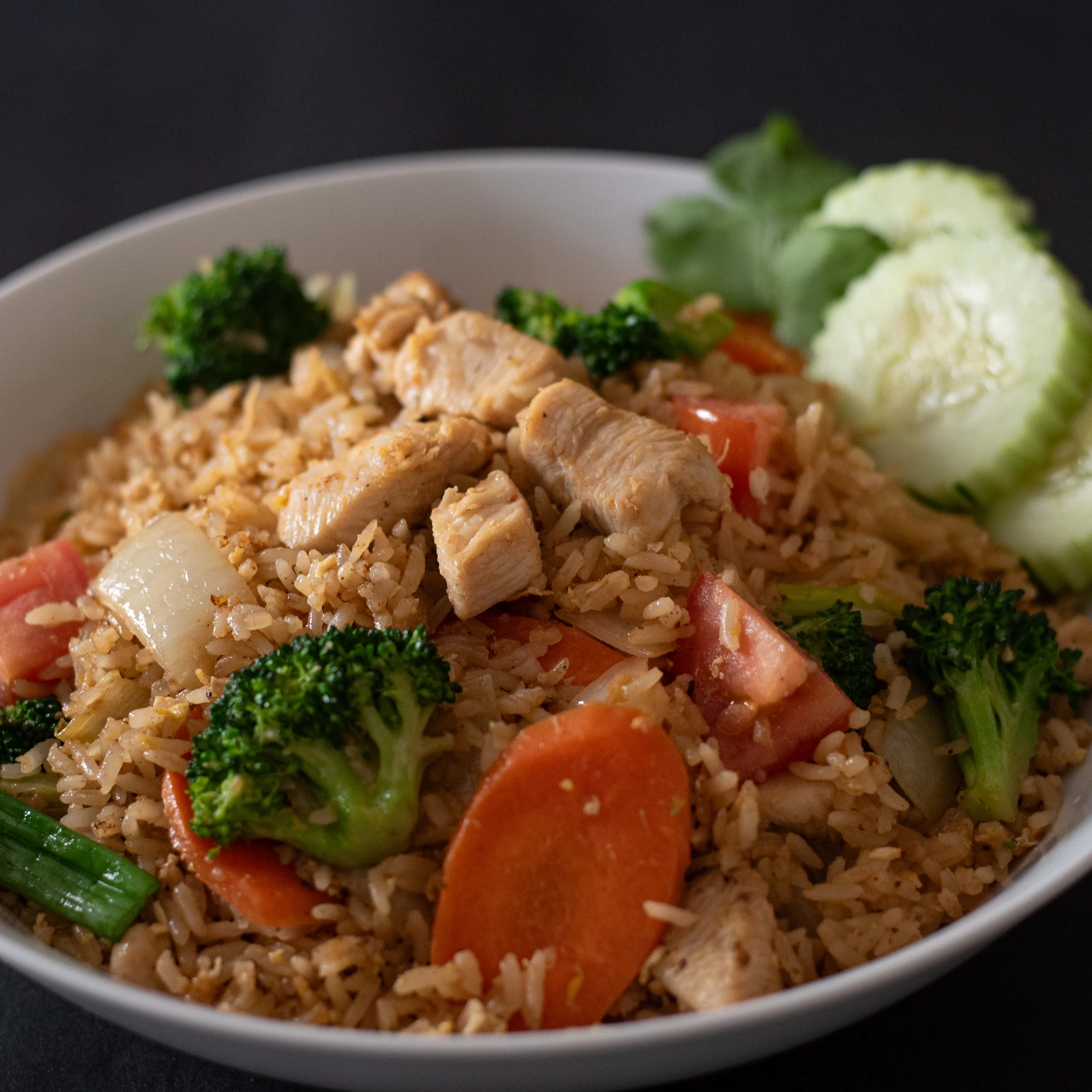 Jasmine rice stir-fried with yellow onions, carrots, broccoli, green onion, tomatoes, and egg, seasoned tastefully with a dash of black pepper and garnished with cilantro, cucumber, and lime. This item is gluten-free.