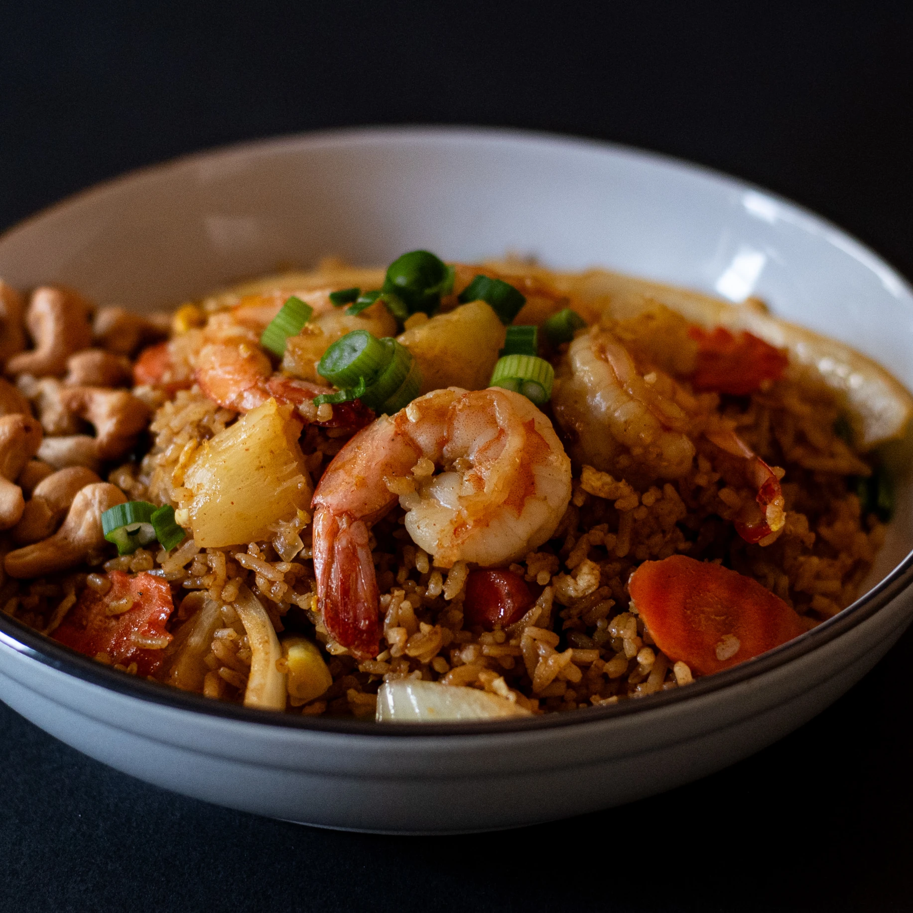 A harmonious blend of fried rice, pineapple, yellow onions, carrots, cashews, yellow curry powder, green onions, and egg, sprinkled with cilantro. This item is gluten-free.