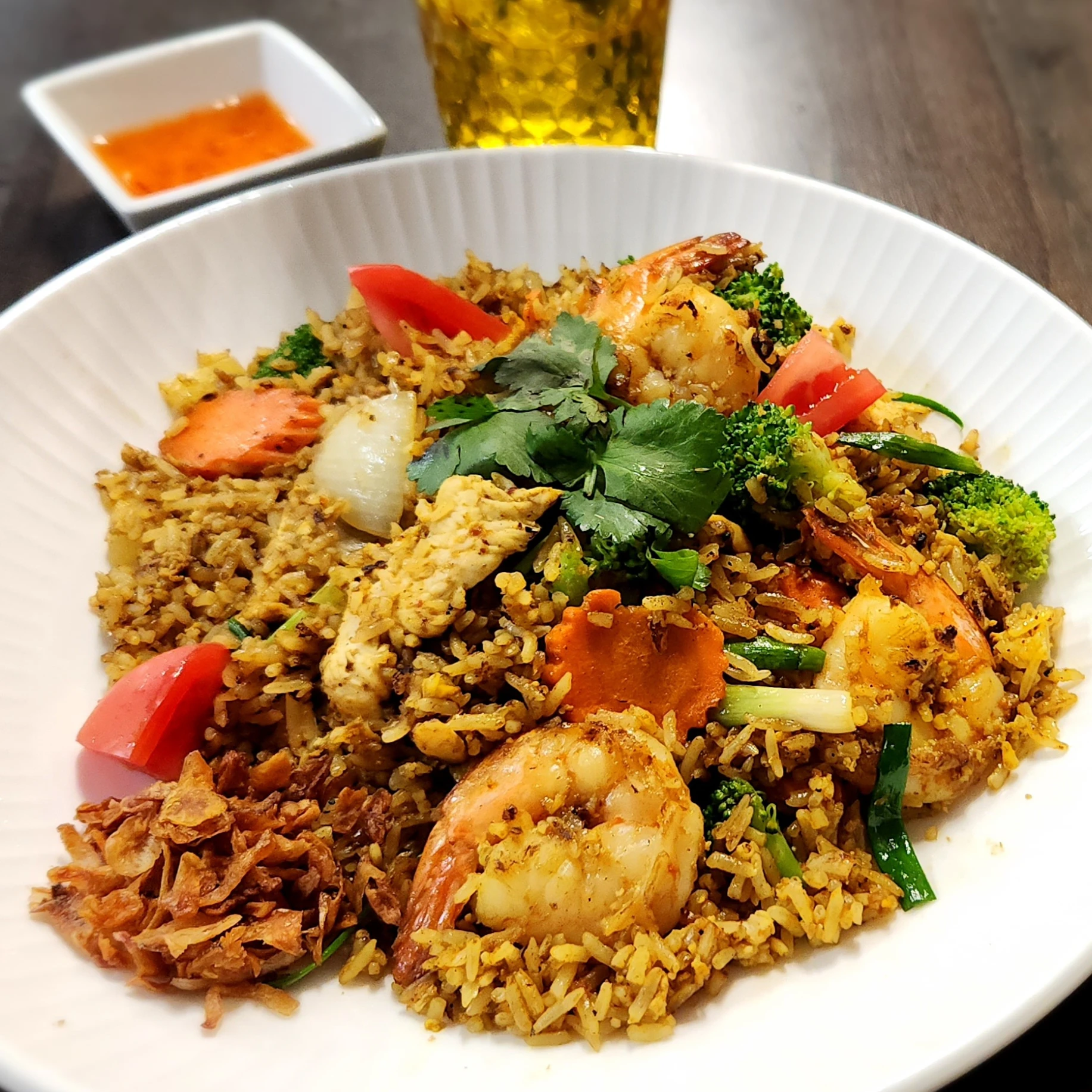 Jasmine rice stir-fried with yellow curry powder and spices, tossed with egg, broccoli, yellow onions, carrots, and tomatoes, topped with cilantro, fried shallots, and a side of sweet chili sauce. This item is gluten-free.