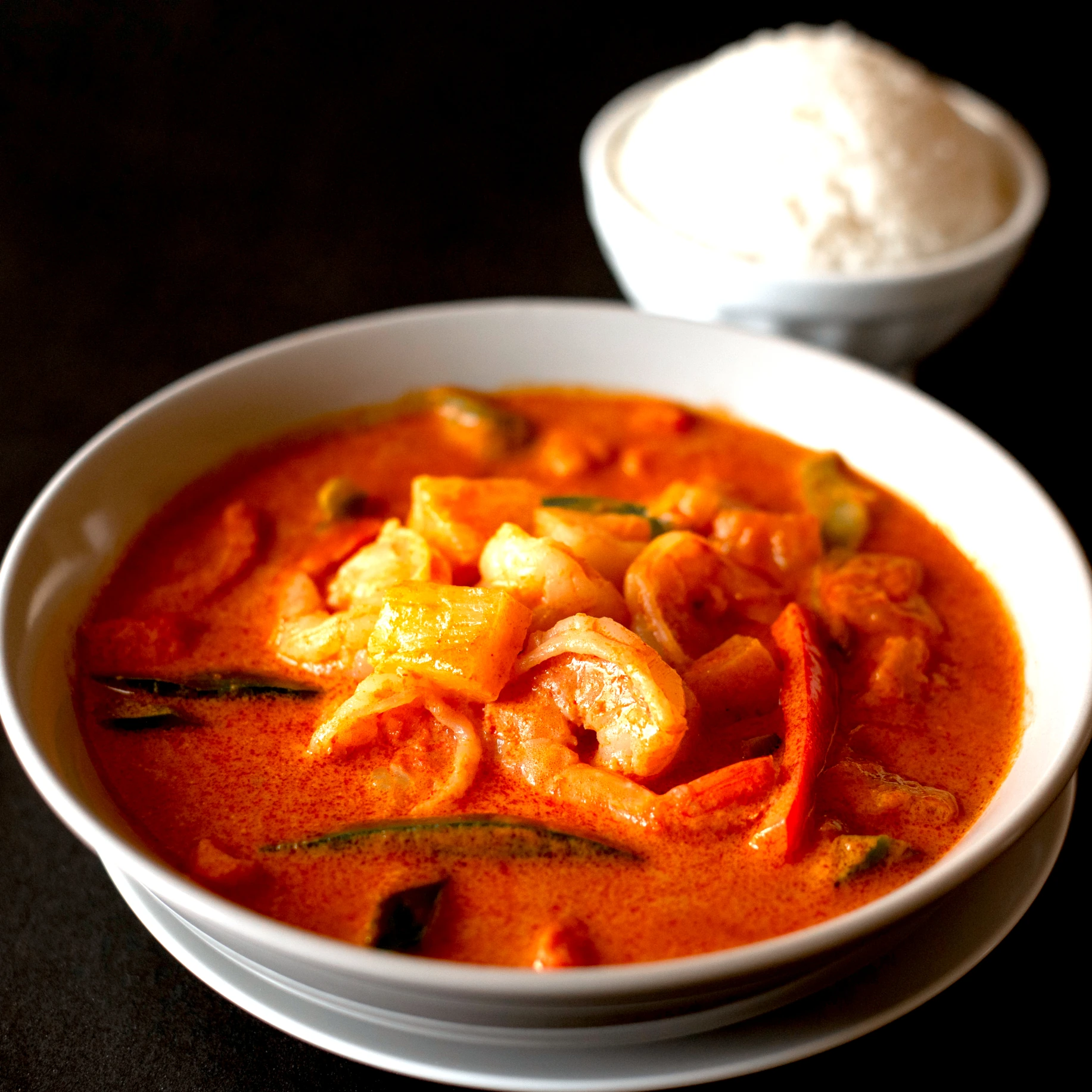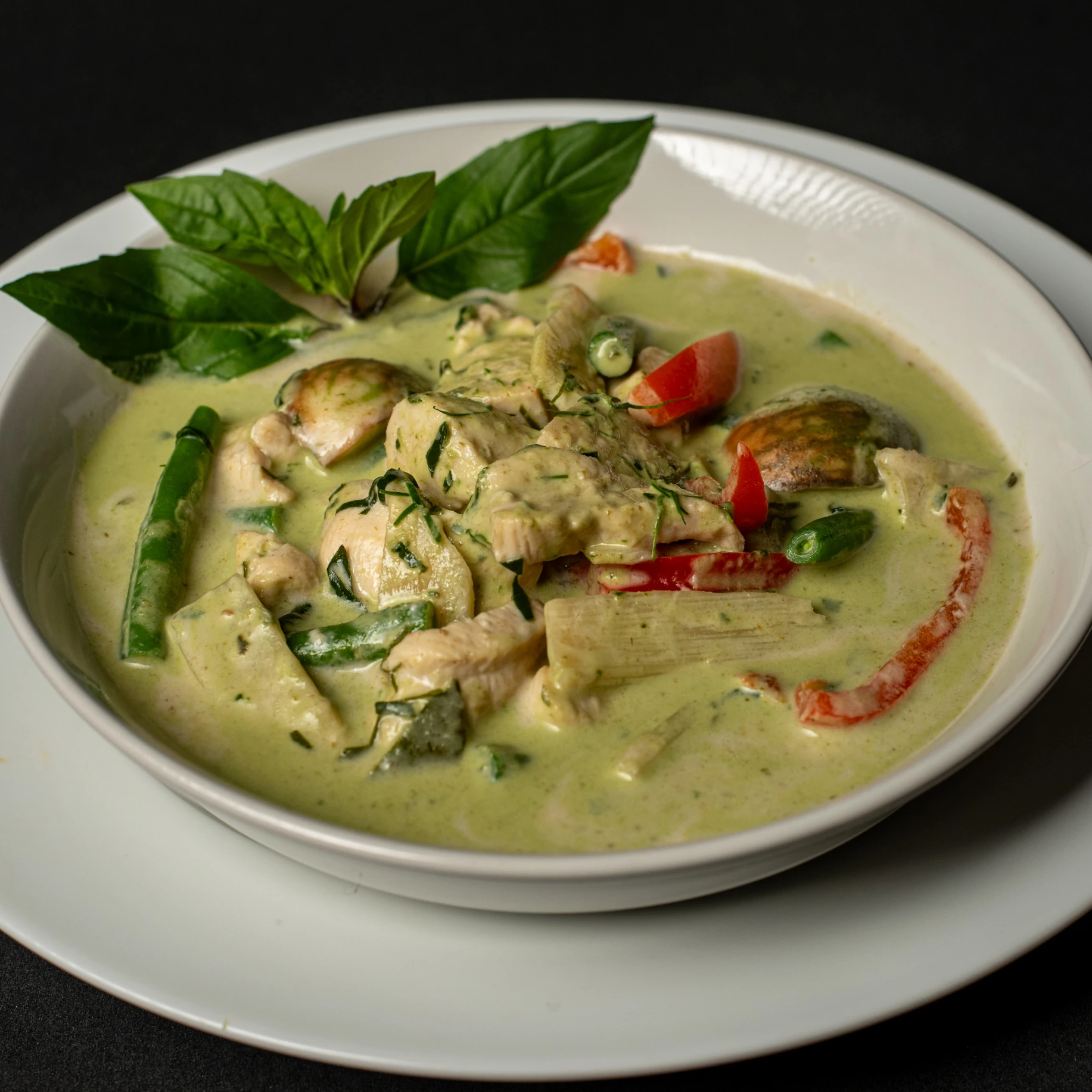 A perfect harmony of spices, aroma, creaminess, and flavors, with bamboo shoots, basil leaves, eggplant, green beans, finely cut makrut lime leaves, and red bell peppers. Served with a side of steamed white jasmine rice. This item is gluten-free.