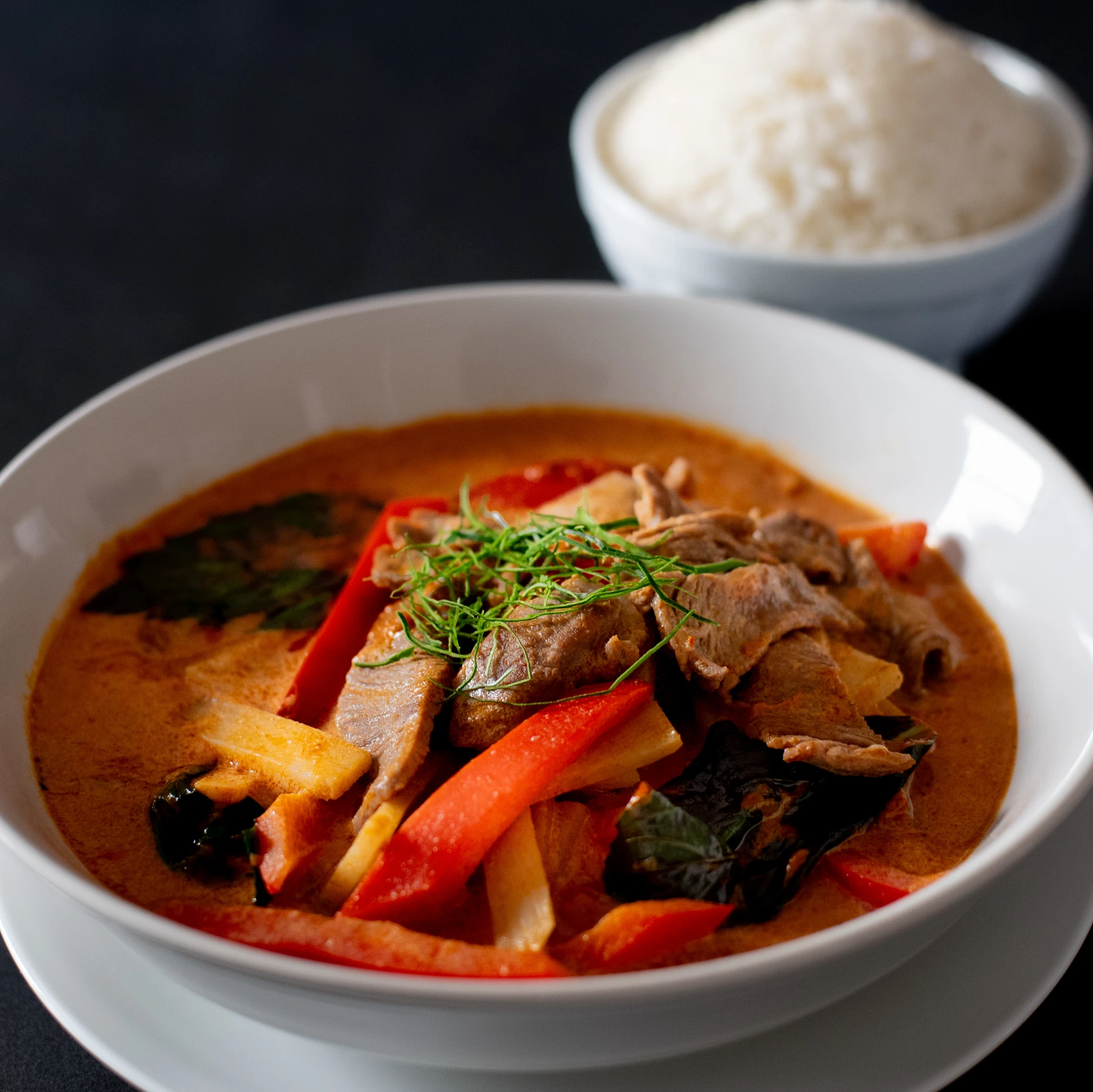 A creamy delight! Coconut milk sauce melds with Bamboo Shoots, Basil Leaves, finely cut makrut lime leaves, and red bell peppers, infused with Panang curry paste. Served with a side of steamed white jasmine rice. This item is gluten-free.