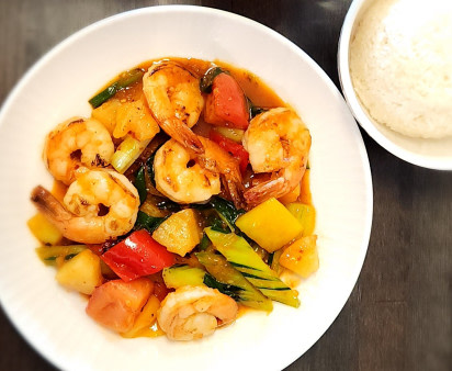 Indulge in Thai stir-fry sweet and sour with your choice of protein, fresh minced garlic, pineapple, tomatoes, yellow onions, cucumber, green onion, yellow bell peppers, green bell peppers, and red bell peppers for a delightful combination. Served with a side of steamed white jasmine rice. Optional gluten-free on request.